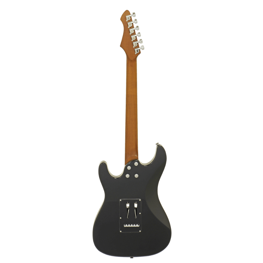 גיטרה חשמלית דגם 714-GTR Fullerton בצבע שחור מבית Aria. הגוף עשוי מעץ פופלר עם פיקגארד מאלומיניום לתוספת עמידות וסטייל ייחודי. הצוואר ולוח האצבוע עשויים מייפל קלוי, בחיבור Heel-less Bolt-on לנוחות גישה מלאה גם לסריגים הגבוהים. מערכת הפיקאפים כוללת שני פיקאפים OS-5 מסוג Alnico-5 ופיקאפ גשר CPH-1 “Classic Power II”, המאפשרים מגוון רחב של צלילים המתאימים לסגנונות נגינה שונים. מתג ה-Coil-tap משולב בכפתור ה-Tone, ומספק שליטה נוספת בעיצוב הצליל.